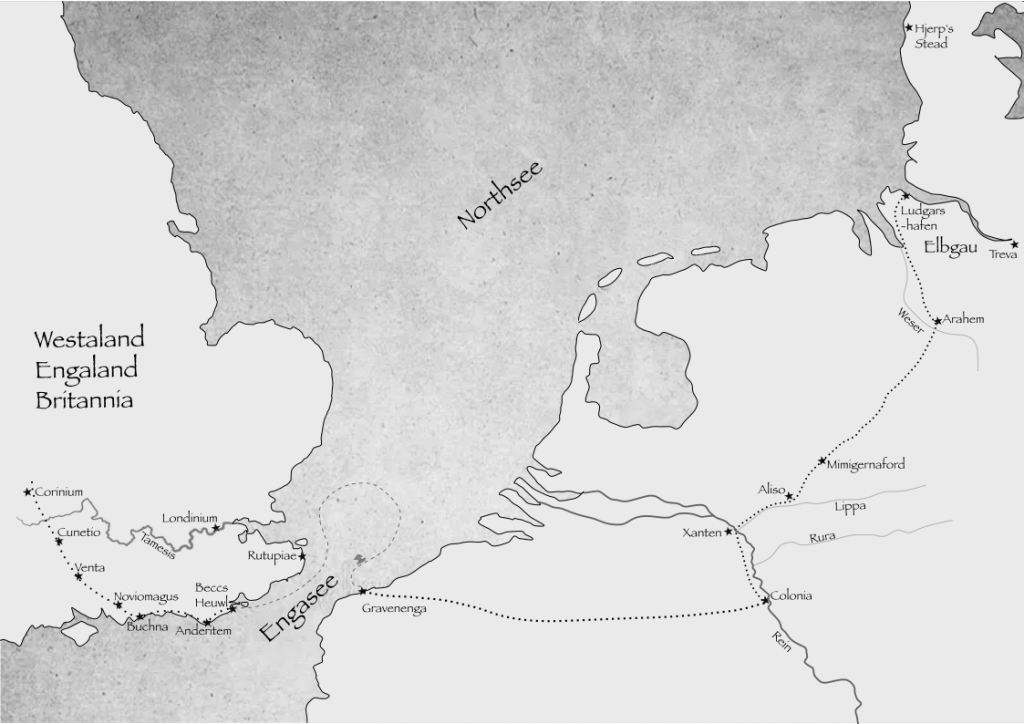 Rendered in the style of the Roman Peutinger Map (Tabula Peutingeriana), this shows Eadgar’s route as he carries out Ulf’s last bequest to find his brother, Atherik, and return him to the Elbgau, where he should take up the position of First.